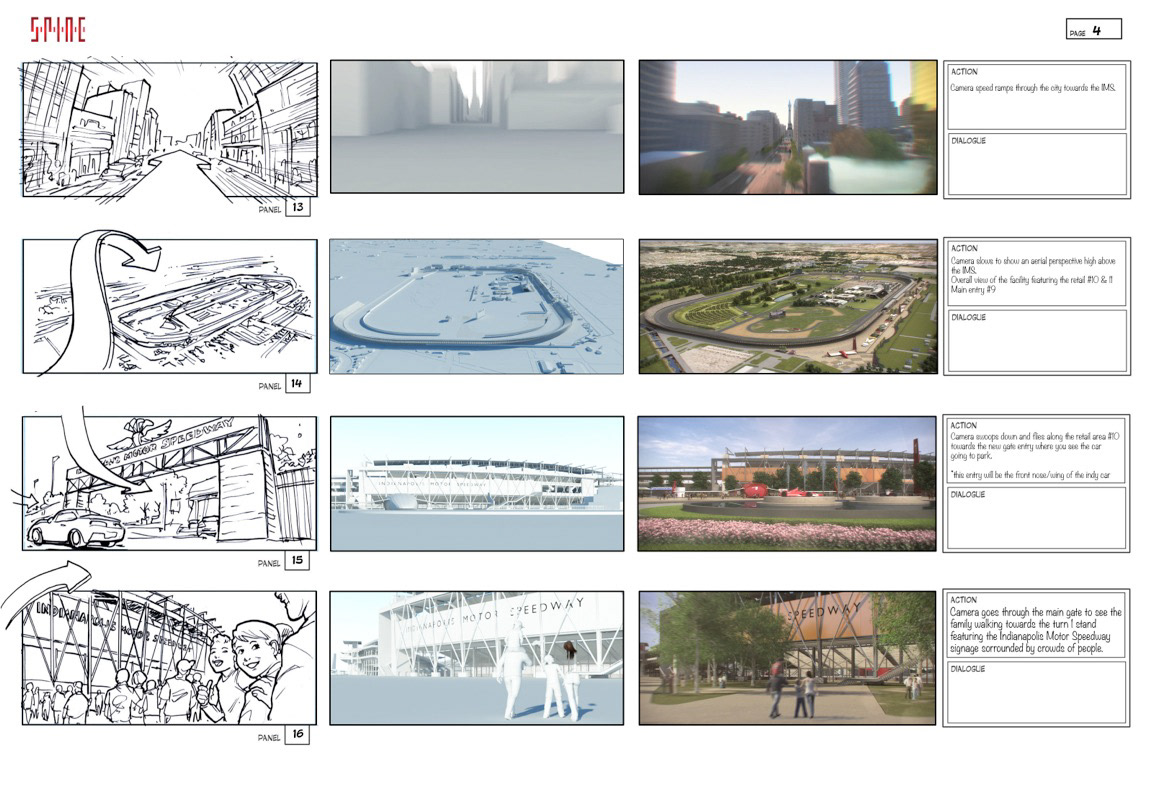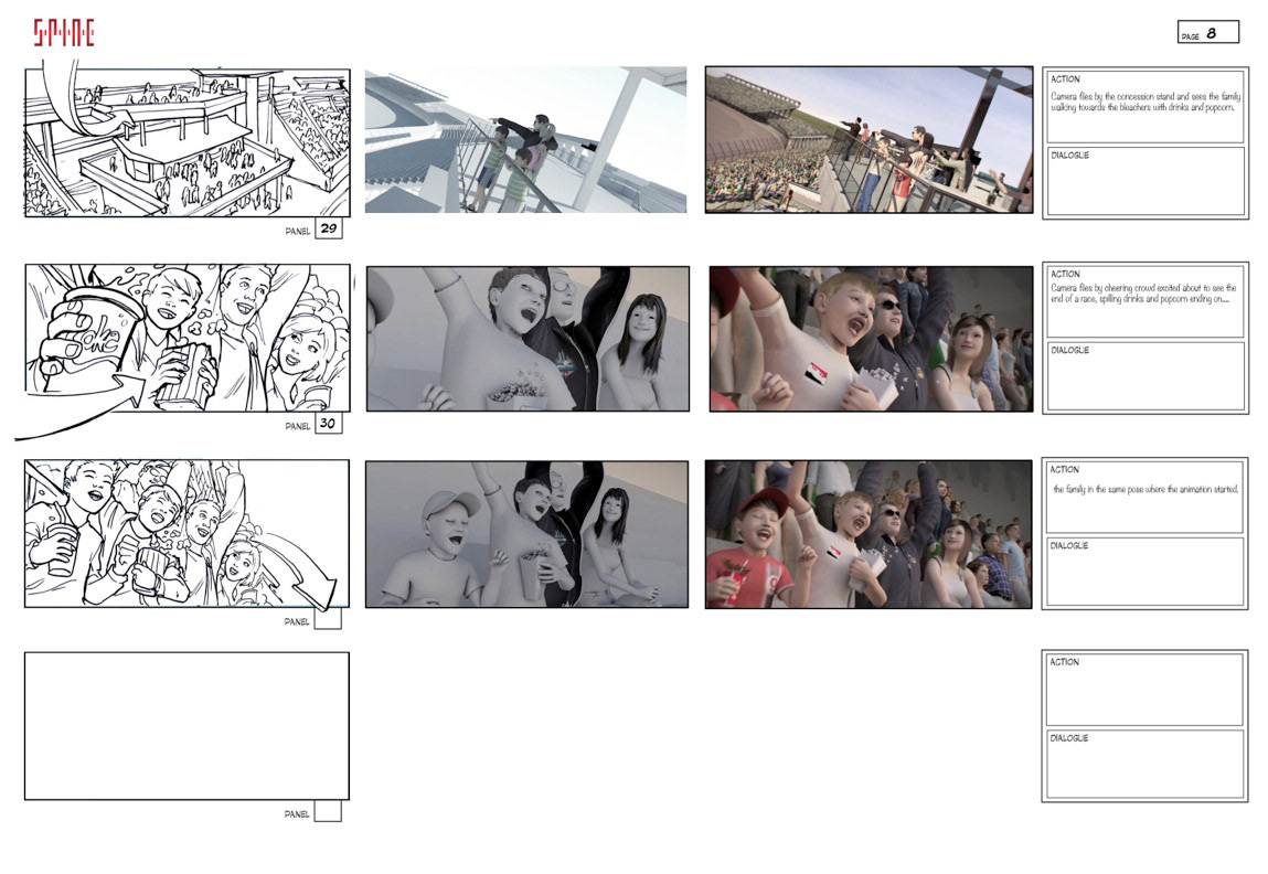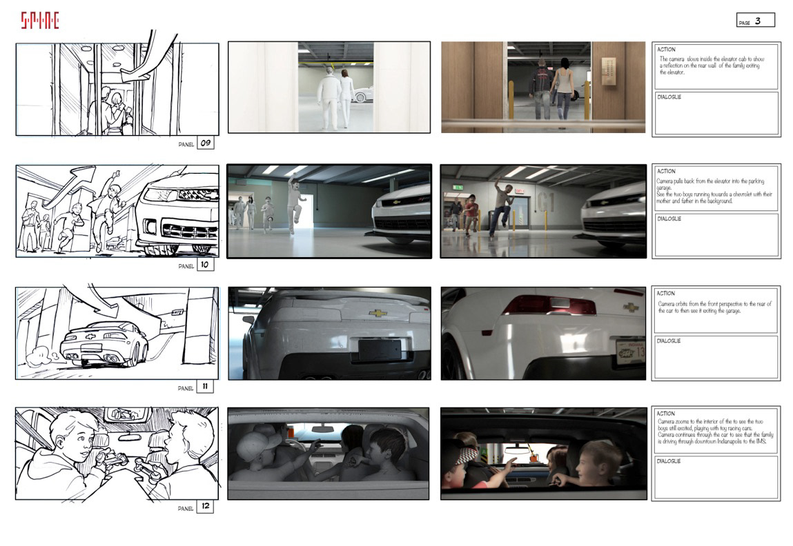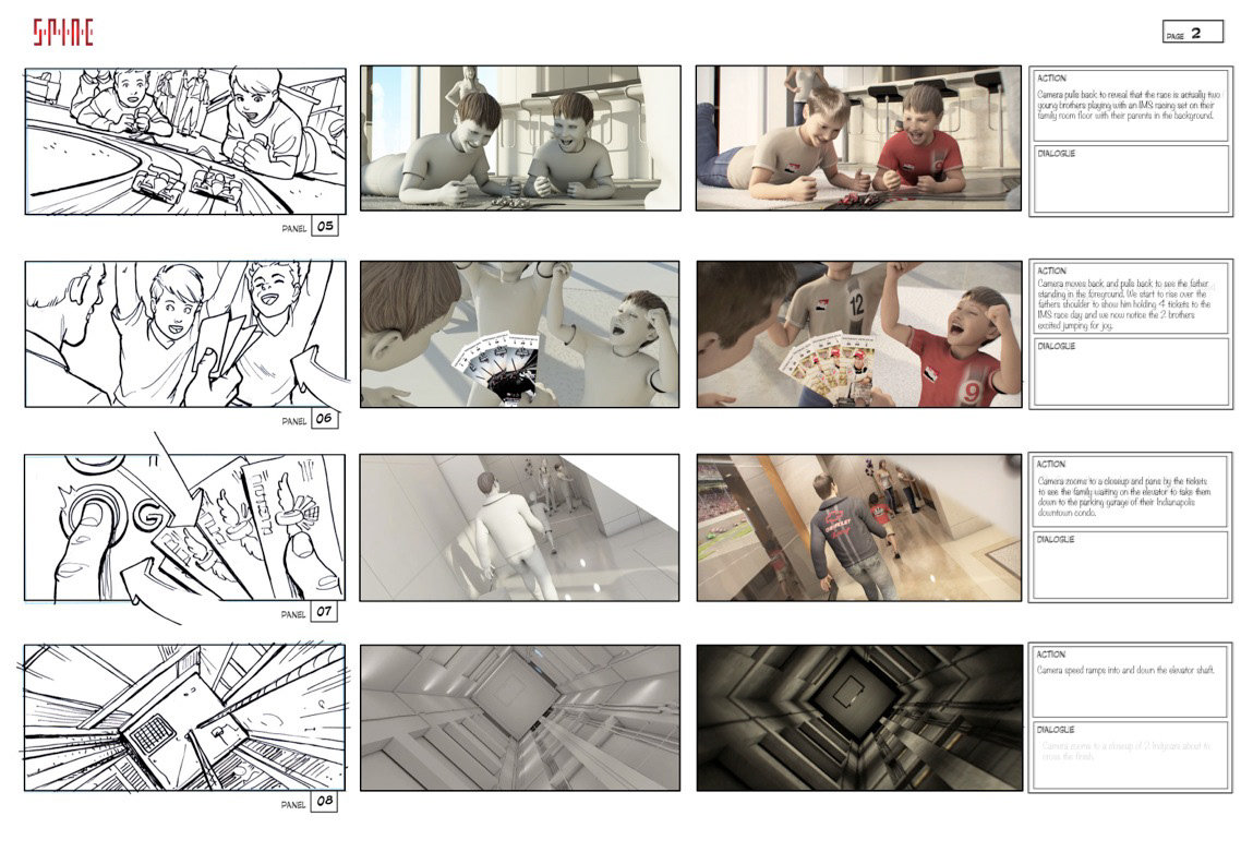 MY STORYBOARDS SHOWN SIDE BY SIDE WITH 3D RENDER STILLS BY S.P.I.N.E. FOR IMS COMMERCIAL.