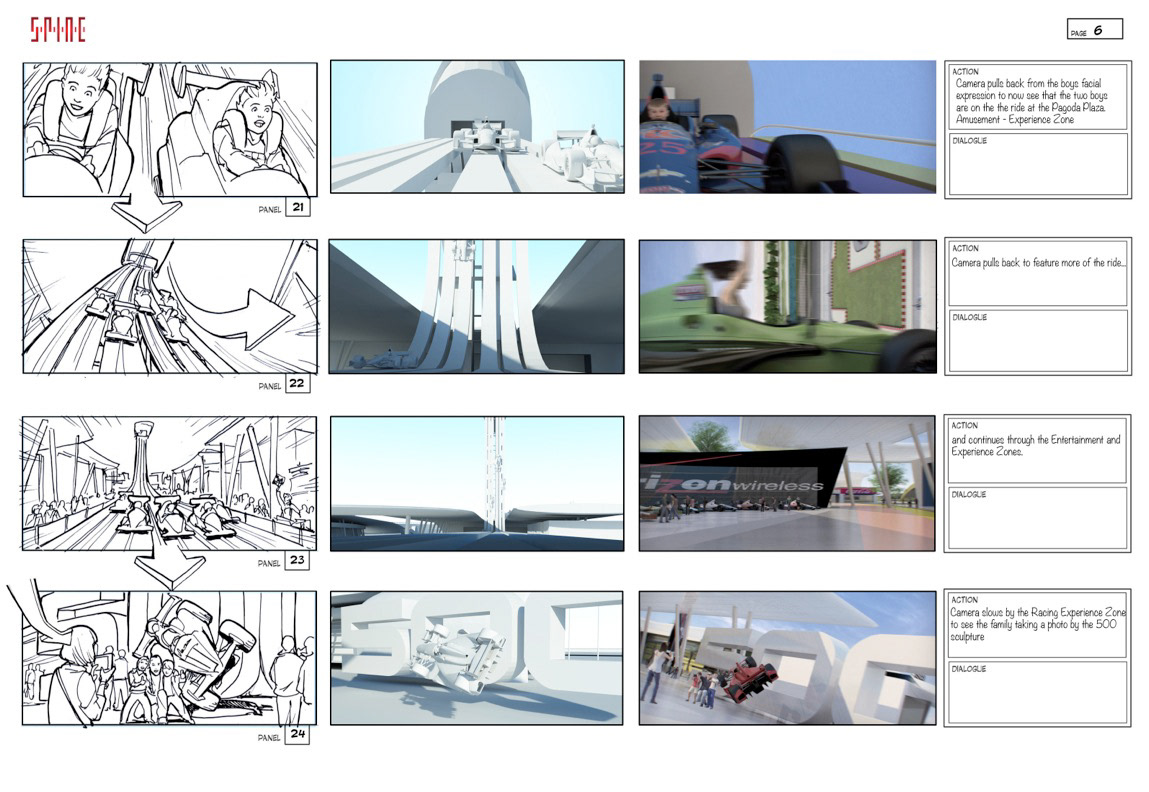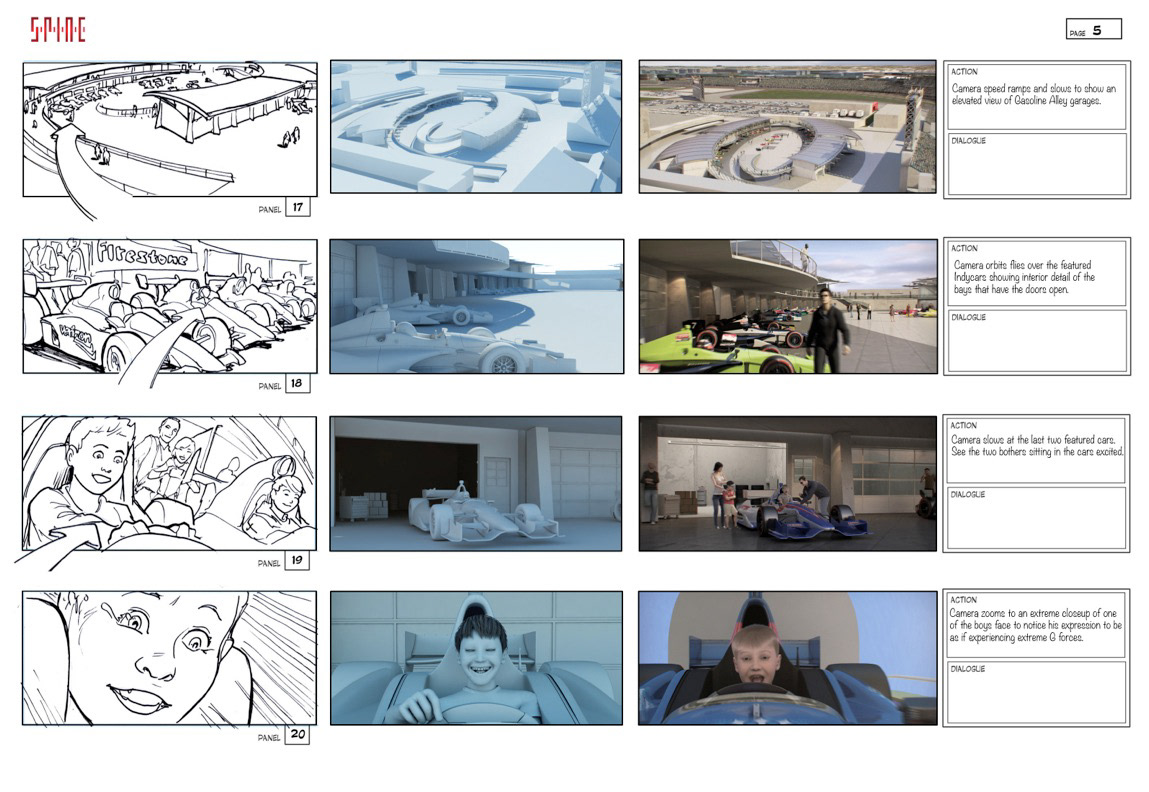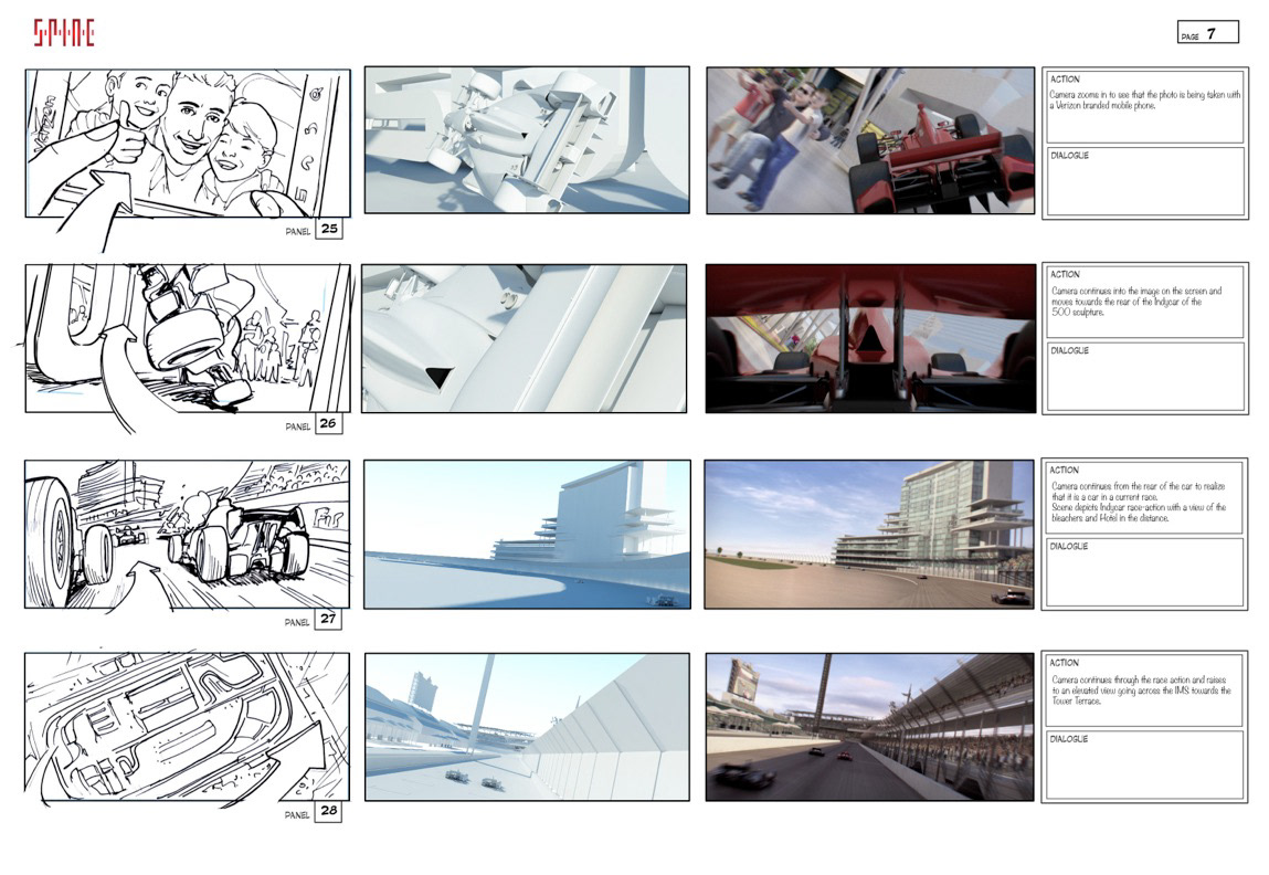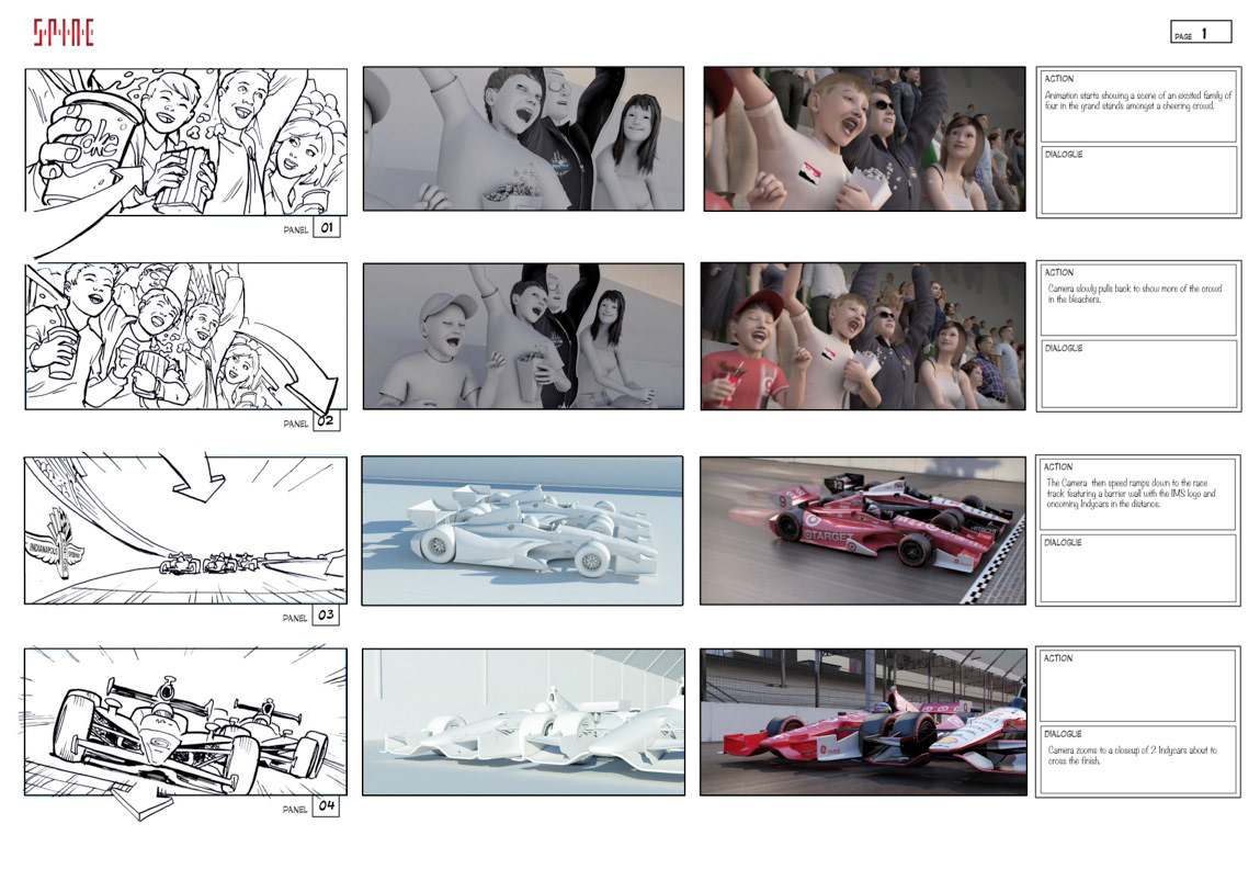 MY STORYBOARDS SHOWN SIDE BY SIDE WITH 3D RENDER STILLS BY S.P.I.N.E. FOR IMS COMMERCIAL.