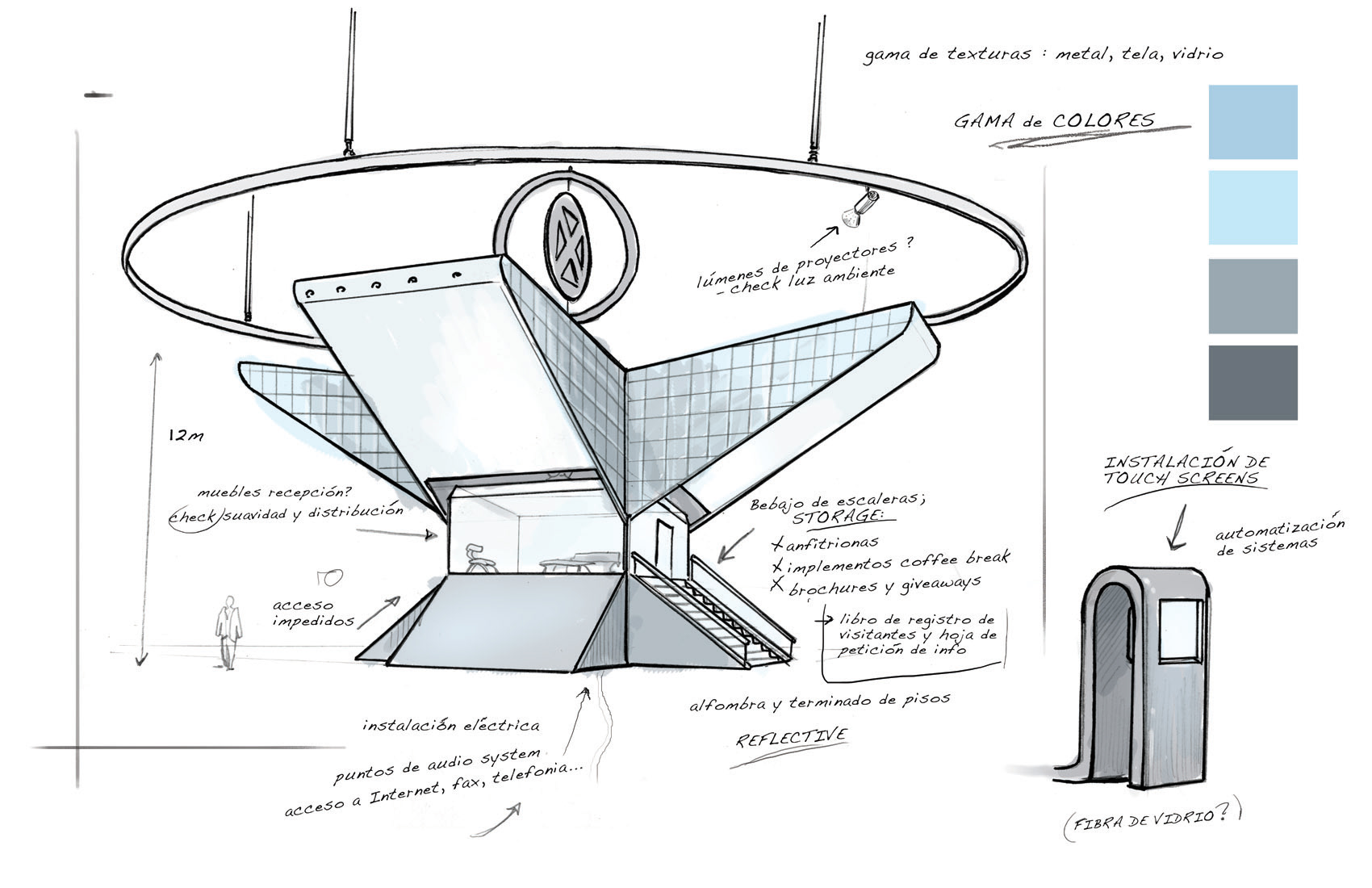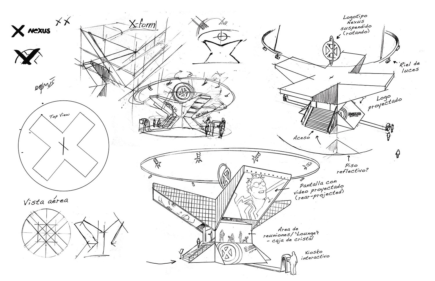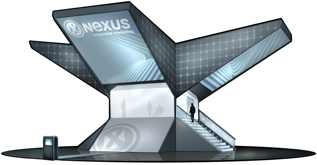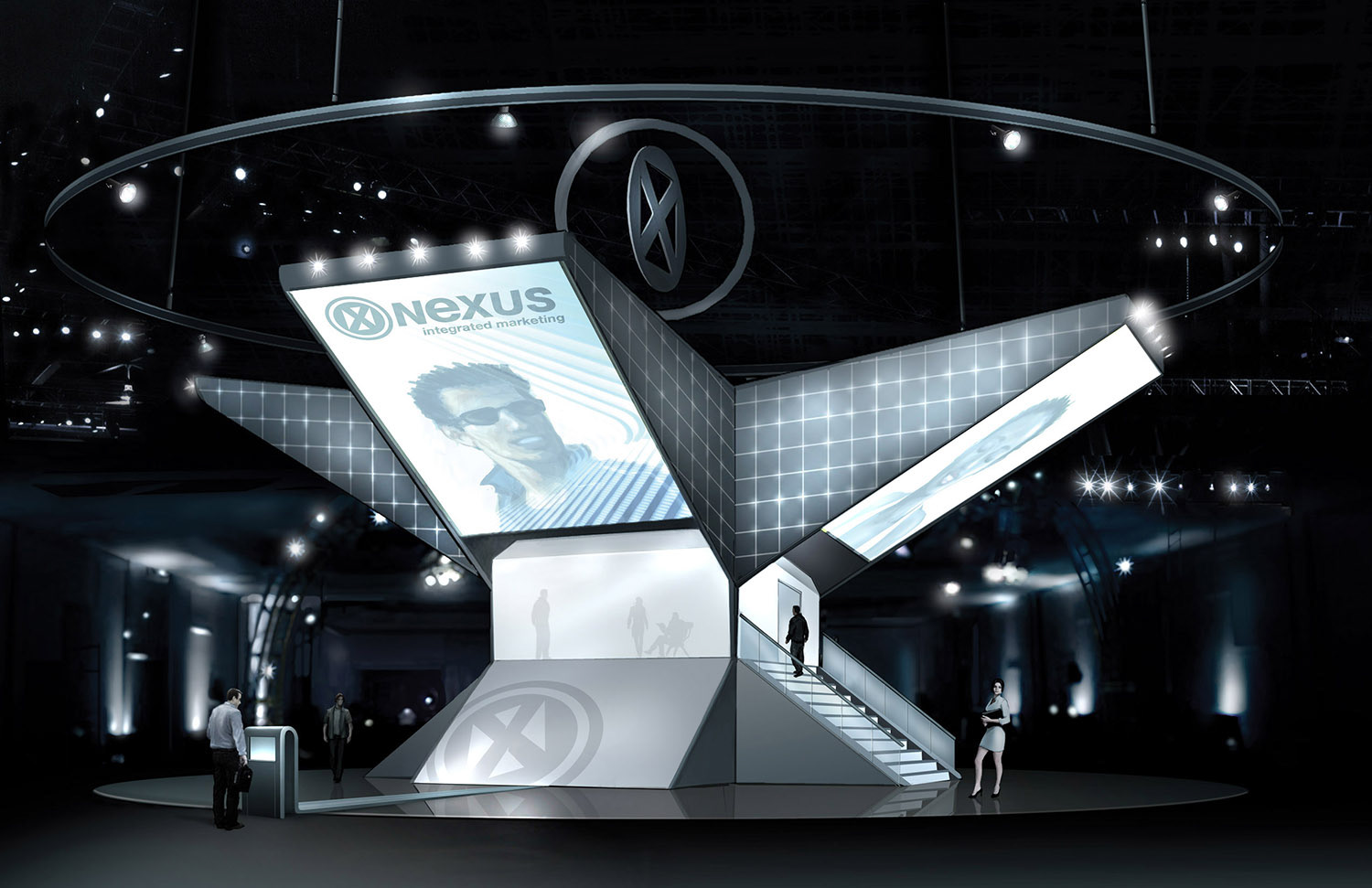 CONCEPT FOR FUTURISTIC TRADE SHOW STAND, BUILT AROUND THE 'X' OF MARKETING FIRM NEXUS.