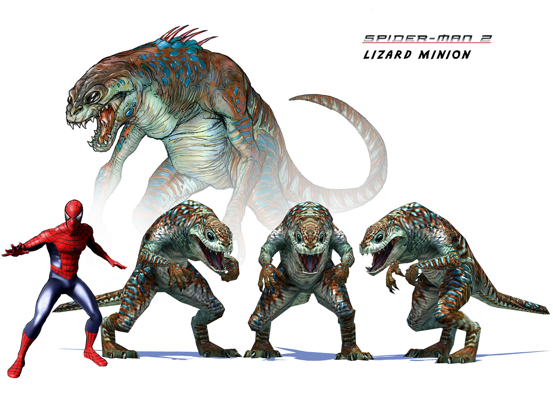 From 2002-2004 at Treyarch I worked on Spider-Man 2 The Movie Game as a concept artist. I attended meetings at Sony Pictures with director Sam Raimi to gather insight into the pre production of the movie, especially the design of Doctor Octopus, which was top secret at the time. While we stayed true to the main plot and design of the movie we added well known characters in the Spider-Man rogue's gallery. I was tasked with giving these a new look, different from the comics. Unfortunately The Lizard and Rhino were cut from the game early, while Kraven and Calypso were PS2 exclusive. This game is known and loved for introducing free roaming to the super hero genre.